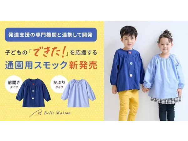 千趣会、「ベルメゾン」で一人で着脱しやすくボタン留めの練習に役立つ「タイプが選べる通園用スモック」を販売