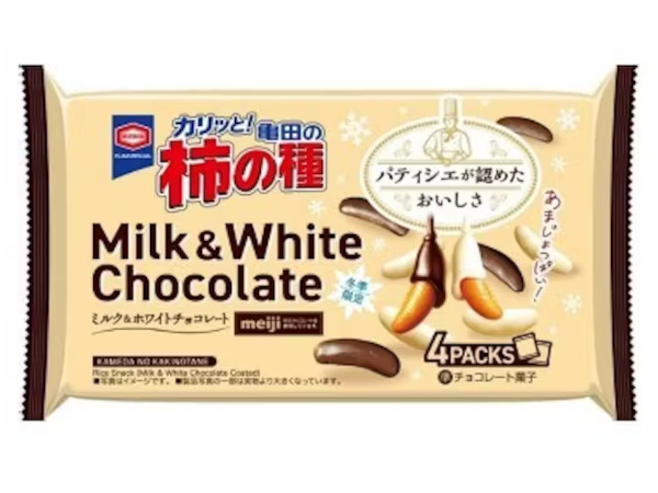 亀田製菓、明治との共同開発商品「亀田の柿の種 ミルク&ホワイトチョコレート」を期間限定発売