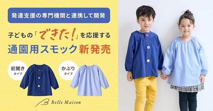 ベルメゾンでは、これまでも「素材がよく伸びて着替えやすいTシャツ」「前後が区別しやすい工夫を施したTシャツ」「スナップボタン仕様のポロシャツ」など、子どもの「できた!」を応援する商品開発に注力してきたが、昨年度から「インクルーシブな社会を目指して、より良い環境づくりに貢献する」をコンセプトに社内プロジェクトを発足。最初の取り組みとして、社内外の協力を得て子ども用スモックの企画開発を進めた。