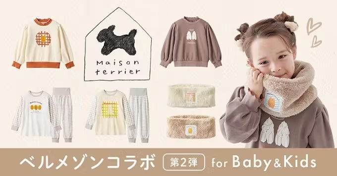 千趣会の通販事業ベルメゾンは、犬モチーフのお菓子が話題の「Maison terrier(メゾン・テリア)」(以下、メゾン・テリア)との2度目のコラボレーションとして、11月1日の「犬の日」に合わせて「メロウ配色裏毛スウェット」「腹巻付き長袖パジャマ」「キッズスヌード」の子ども服3アイテムをベルメゾンネットで販売を開始する。