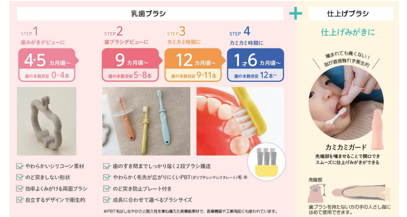 乳歯ブラシは、月齢・歯の生える時期を4ステップに分類。それぞれの時期の発達に合わせて歯ブラシを選ぶことができる。仕上げブラシは、握りやすい三角形状の柄で赤ちゃんのみがき残しの汚れを落としやすい歯ブラシとのこと。また仕上げみがきの際に口を閉じてしまう、歯ブラシを噛んでしまうという悩みに応えて生まれた「カミカミガード」をセットにしたタイプもあり、子どもの開口を促しスムーズな仕上げみがきをサポートする。歯ブラシはやわらかく毛先が広がりにくいPBT(ポリブチレンテレフタレート)毛((PBT毛はしなやかさと耐久性を兼ね備えた高機能素材で、医療機器や工業用品にも使われている))を採用。歯のすき間までしっかり届く2段のブラシ構造となっている。