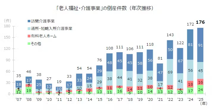 東京商工リサーチ、2025年「老人福祉・介護事業」倒産動向、倒産は過去最多の176件で「訪問介護」の倒産が突出