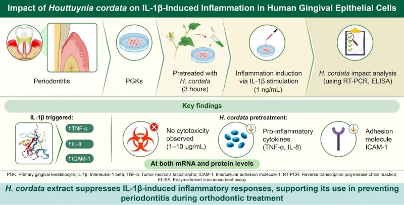 同研究によって、ドクダミエキスが歯肉上皮細胞におけるIL-1β誘発性炎症に対して抑制作用を示すことが明らかとなった。IL-1βは、矯正歯科治療の初期段階で歯周組織において顕著に産生が増加し、歯周炎の程度と相関することが知られている。したがって、ドクダミエキスは矯正歯科治療中に起こりうる歯周炎の予防に有用である可能性が示唆された。