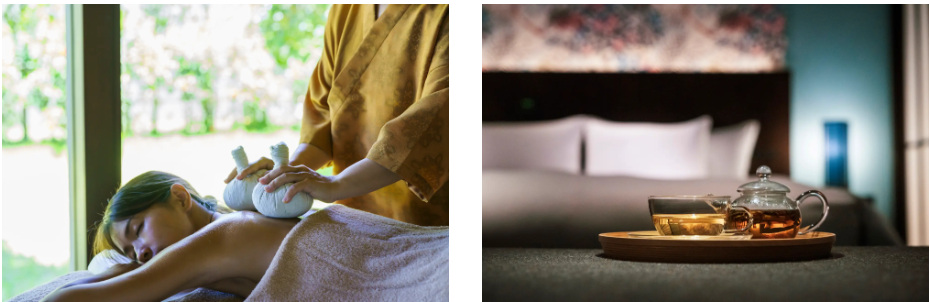 上質な睡眠には、身体をあたためたり、リラックスをすることが大切。星のや沖縄のスパトリートメント「月」では、月桃の香りと肌触りが心地よい「月桃玉」で睡眠前の身体をほぐす。さらに、滞在中のパジャマには、着ることで血行促進作用が働き、筋肉のコリや冷えの改善に効果のあるセルフメディケーションウェア(一般医療機器「Resona Bio」長年の研究開発を経て誕生したレゾナウェア技術を用いて、血行促進作用の最大化を目指す日本発のアパレルブランド。分子レベルの働きによって、分子間摩擦熱を発生させ、末梢血管の組織血流量を増大させる原理に基づく)を用意した。睡眠の前後には、施設の庭で採取したハーブで作るオリジナルハーブティーで、快適な眠りと爽やかな目覚めを迎えられる。