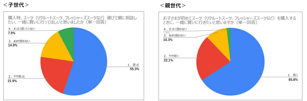 子どもが中学生、高校生、大学生などと成長していくと、部活動やサークル、バイトなど家族以外のコミュニティが増え、親子で一緒に体験するコト消費の頻度が減少してくる。そのような中でもスーツ購入の際、「親に相談したい」「親と一緒に行きたい」と考えている子世代は、全体の77.2%という結果になった。特に初めてのスーツ購入において、子どもたちは親の意見やサポートを重要視しているようだ。また親世代においても、87.9%が子どものファーストスーツ購入に一緒に行きたいと回答。親が子どもの人生の節目となる大切な買い物を、一緒に体験し、サポートしたいという強い思いがあることが浮き彫りになった。