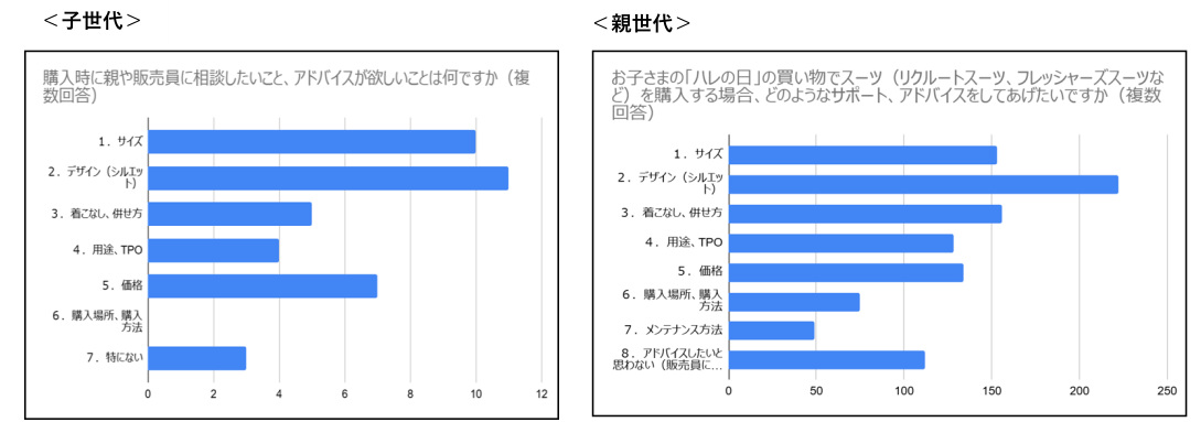 子世代は、スーツの購入において「親からのアドバイスが欲しい項目」は、「デザイン・シルエット」が最多となっており、見た目の印象や自分に合ったスタイルへの関心が高いことが明らかになった。同様に、親世代が自分の子どものスーツを選ぶ際にアドバイスしたいポイントは、「デザイン・シルエット」で、次いで「サイズや着こなし」も多くを占めた。