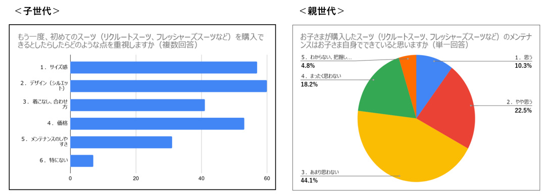回答者の62.3%の親が、子どもが正しくメンテナンスができていないことへの懸念を示しており、子どもがスーツを傷めずに長く着用できるかについて不安を抱えていることが明らかになった。子世代も、イージーケアの重要性は理解しているものの、スーツ購入時の重視するポイントとして、「メンテナンスのしやすさ」は低い結果となっている。日々の手入れの重要性を理解しながらも、「サイズ感」「デザイン」といった自分らしさを表現できる見た目に関する項目が上位にあがっている。