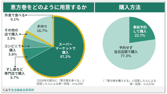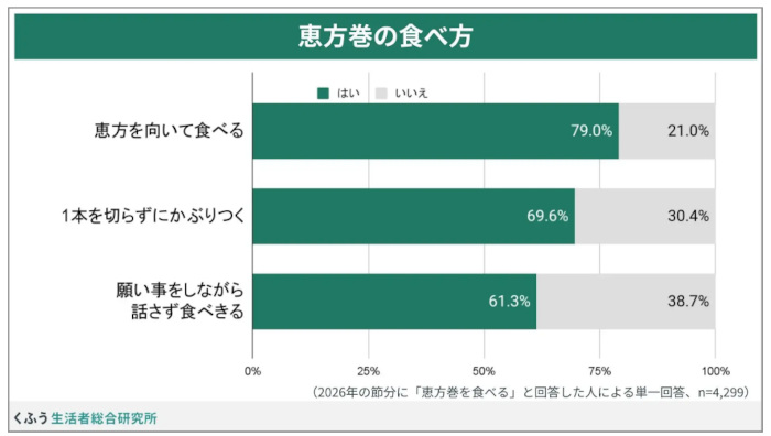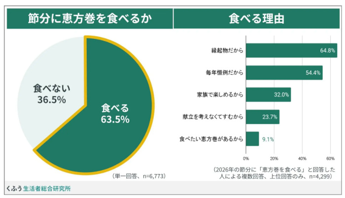 くふう生活者総合研究所の「恵方巻」に関する調査、節分に食べる人は63.5%で縁起物として食べ方にこだわる人が多数派に