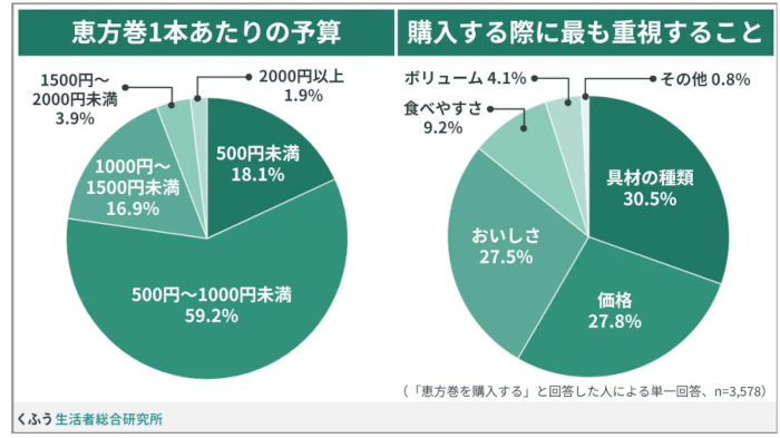 1本あたりの予算は「500円~1000円未満」の価格帯が59.2%と最も多く、平均予算は818円。2025年の調査では平均予算777円だったため、約40円上がった。購入する際に最も重視することとして、「具材の種類」(30.5%)、「価格」(27.8%)、「おいしさ」(27.5%)がいずれも約3割で並んだ。