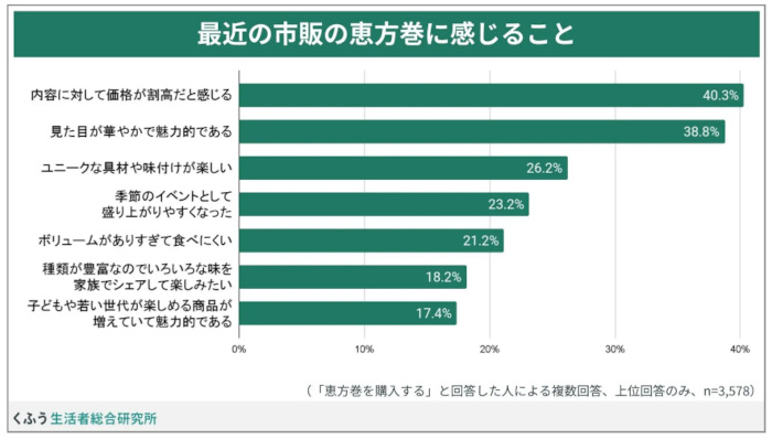さまざまな物の価格が上がる中、市販の恵方巻についても「内容に対して価格が割高だと感じる」(40.3%)という声が最も多く挙がった。僅差で「見た目が華やかで魅力的である」(38.8%)、さらに「ユニークな具材や味付けが楽しい」(26.2%)、「季節のイベントとして盛り上がりやすい」(23.2%)とポジティブな意見が続いた。
