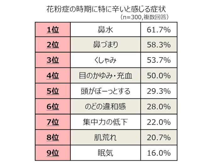 はじめに、花粉症の時期に特に辛い症状について尋ねたところ、花粉症の人の半数以上が「鼻水」や「鼻づまり」、「くしゃみ」といった花粉症の代表的な症状に悩んでいることが分かった。その他にも、「のどの違和感」や「集中力の低下」、「眠気」などの症状を抱える人もそれぞれ約2割程度いることから、花粉症の症状は人によって多岐にわたることがうかがえる。
