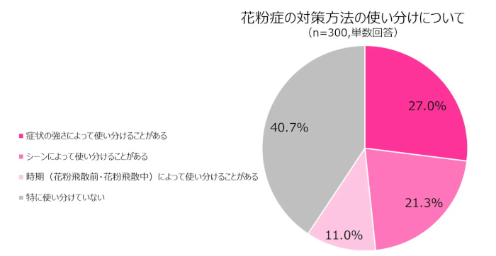 花粉症対策の使い分けについて尋ねたところ、全体の約60%が対策を使い分けていると回答した。中でも、病状の強さによって使い分けると回答した人が27.0%と最も多く、シーンで使い分ける人が21.3%、花粉の飛散前後など、時期によって使い分ける人は11.0%となった。