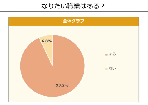 回答した人のうち、93.2%の子どもたちが「なりたい職業がある」と回答した。一番人気の職業は世代によって異なり、小学生では「イラストレーター」、中学生では「ミュージシャン・音楽家」がそれぞれ1位だった。
