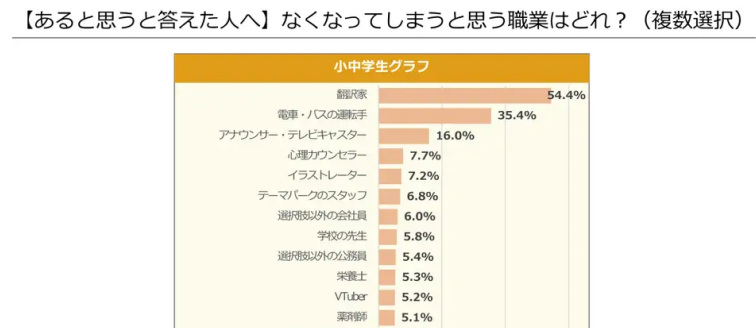 なお、10年後になくなりそうな職業を聞いた設問では、「翻訳家」「電車・バスの運転手」「アナウンサー・テレビキャスター」の3つが上位を占めた。自由回答の意見も含め、AIやロボットが代行可能な仕事はなくなりやすいと考える傾向があった。