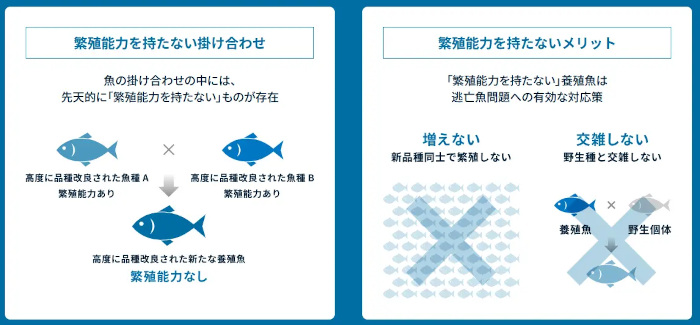 「夢あじ」は、先天的に繁殖能力を持たない「一代限りの養殖魚」となる。そのため、万が一自然災害などで魚が生け簀から逃亡した際にも、夢あじが自然界で増えることはない。また、野生のカイワリやマアジとの交配が発生することもなく、生態系への悪影響を防ぐことができる。夢あじは、“品種改良された美味しい魚の養殖”と“生態系のサステナビリティ”の両立を実現する新たな養殖魚として業界からの期待を集めている。