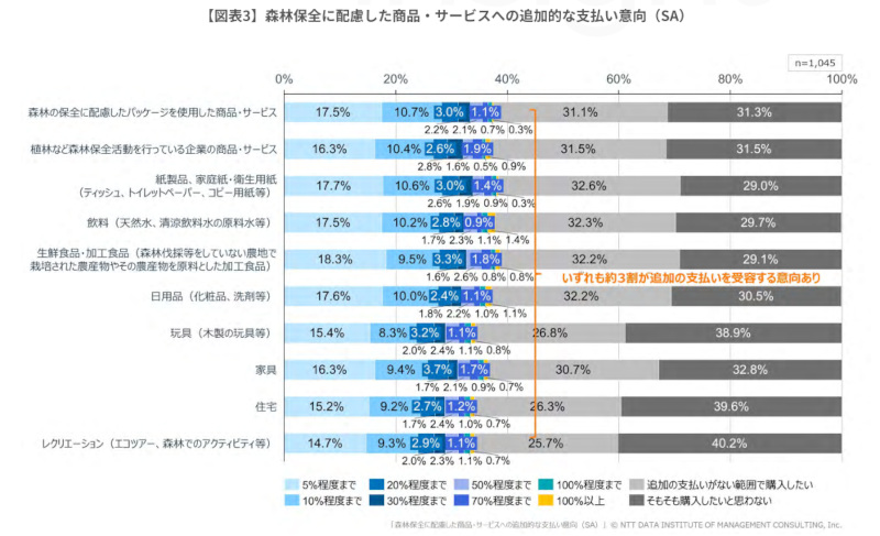 森林保全に配慮した各種商品・サービスに対する追加の支払い意向とその程度を把握するため、全員(n=1045)を対象に調査を実施した。その結果、いずれの商品‧サービスも回答者の約3割が追加の支払いを受容する意向を示した。
