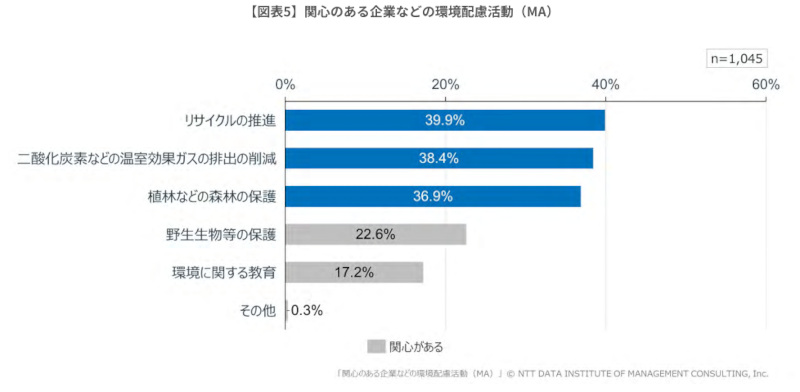 企業などの環境配慮活動のうち、関心のある取り組みについて全員(n=1045)を対象に調査した。その結果、「リサイクルの推進」(39.9%)、「二酸化炭素などの温室効果ガスの排出の削減」(38.4%)、「植林などの森林の保護」(36.9%)の順に多く、いずれも約4割が「関心がある」と回答した。