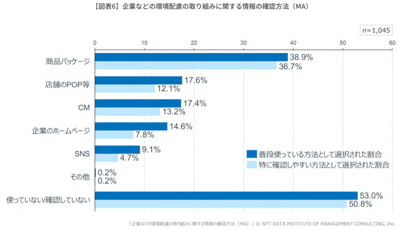特に確認しやすい方法についても、普段使用する確認方法と同様の傾向がみられ、「商品パッケージ」(36.7%)が最多で、「企業のホームページ」(7.8%)、「SNS」(4.7%)は普段使用する確認方法以上に回答率が低い結果となった。