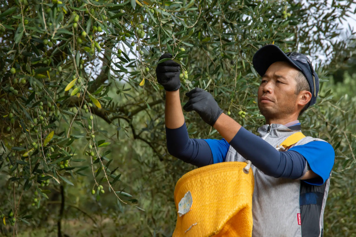 オリーブ生産者たちは、一本一本のオリーブの木に深い愛情とこだわりを持ち、丁寧に収穫作業を行う。特に新漬けオリーブ用果実は、手のひらで包み込むようにして枝から摘みとる「手摘み」で収穫することで、果実を傷つけることなく、よい状態のものだけを選りすぐることが可能になる。国東の温暖な気候と農園スタッフたちの手仕事によって育まれたオリーブは、土地の恵みがダイレクトに伝わる、この時期だけの味わいを私たちに届けてくれるのだという。