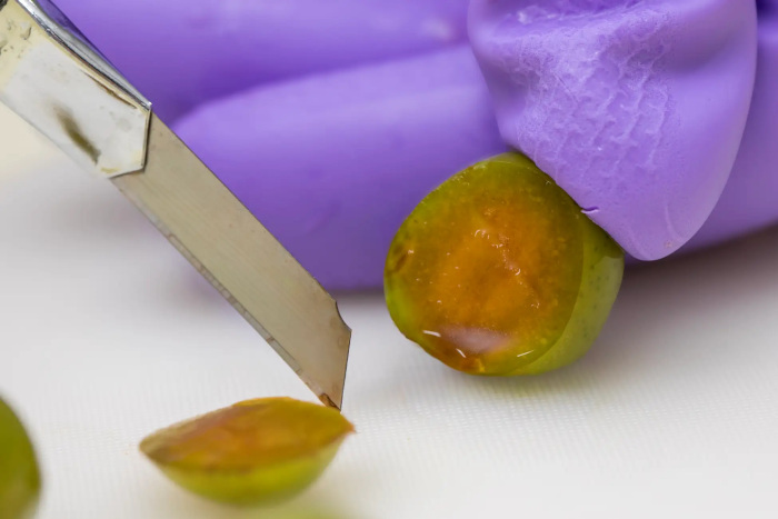 実の断面から渋の抜け具合を判断、塩水漬け込みへ