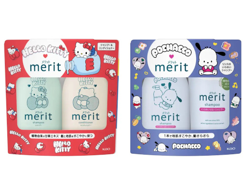 花王、へアケアブランド「merit」から「ハローキティ」「ポチャッコ」「ポムポムプリン」のデザインボトルを数量限定発売