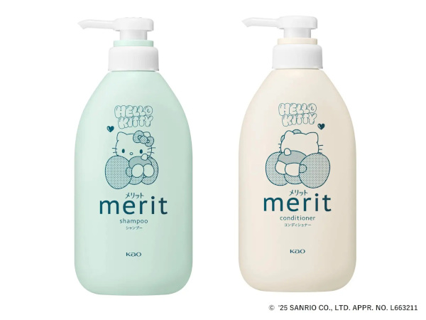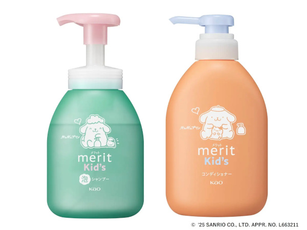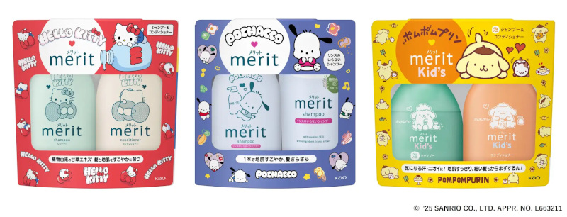 花王、へアケアブランド「merit」から「ハローキティ」「ポチャッコ」「ポムポムプリン」のデザインボトルを数量限定発売