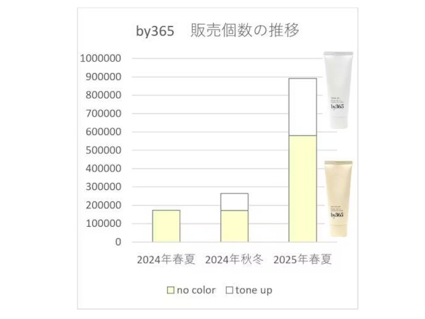 「by365 パウダリーUVクリーム」は、昨年2月の発売以降、その独自のテクスチャーがユーザーに受け入れられて売上を伸ばし、今年2月には、同様のテクスチャーで肌色をトーンアップさせる追加品「by365 パウダリーUVクリーム トーンアップ」を発売。2品の累計販売個数は148万個を超えている(2025年11月末現在)。企画開発当初の設定に比べ多くのユーザーに使用されるアイテムへと成長したため、ユーザーからのニーズも多数届くようになった。最も多い声は、まるで塗ったことを忘れるかのようなサラサラのテクスチャーの快適さに対する賞賛だったが、一部では「香りがない方が良い」という声もあった。同社では、日焼け止めは以前のように夏場や日射しの強い季節・シチュエーションにのみ使用するアイテムではなく、季節を問わずスキンケアをするように使用したいというニーズを捉えていたため、より多くの人が快適に使用できることを目的に、「リネンの香り」を廃番とし、無香料タイプにリニューアルすることにした。無香料に変更するにあたり、「by365 パウダリーUVクリーム トーンアップ」についても併せてパッケージ変更と価格改定を行う。「by365 パウダリーUVクリーム トーンアップ」は、今年2月の発売当初から無香料の処方で発売していたため、中身の変更はないとのこと。