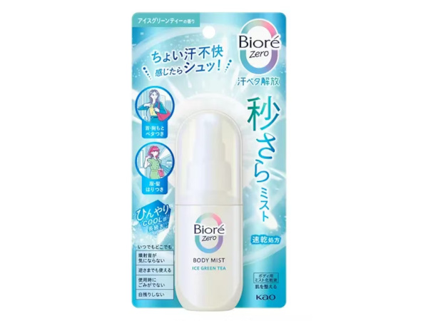 「ビオレZero ミスト」は、シュッとひと吹きした瞬間に肌上の汗を瞬時に薄く広げて蒸散させ、肌をさらさらに整える。さらに、花王独自技術の凹凸撥水塗膜を形成することで、再びかいた汗をはじき、ベタつきによる不快感を軽減する。また、清涼剤(メントール)を配合し、ひんやり感が長時間持続する。