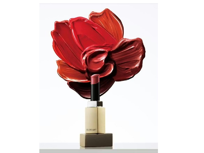 「グロリアート」は、同社の最高級ブランドとして1991年に生まれ、そのネーミングは「GLORIA(輝かしい)」と「ART(芸術)」に由来している。当時はべースメークブランドとしてデビュー、その後ポイントメークもそろえたブランドに進化した。その中でずっと変わらないのは、スキンケア効果とつけ心地のよさを大事にしてきたブランドだということ。コロナ禍以降、マスクの着用頻度が増えたことで口紅の色の持続効果は以前にも増して求められるようになり、今では必須機能ともいえる。同社でも口紅の持続効果の研究を重ねてきたが、今回は色味が持続する「フィットフィルム技術」を採用しただけでなくつやを与えることや、なめらかなつけ心地も実現している。これまでの色が持続するタイプの口紅で感じた塗膜の薄さや乾燥感を払拭したひっかかりのないつけ心地。つや感が醸す錯視効果でふっくらと若々しい唇を演出する。