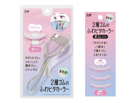 「2層ゴムのふわピタカーラー」は、替ゴムの硬度を2層にした新発想のカーラー。厚さの異なるやわらかゴムと硬めゴムの「2層構造ゴム」がまつげを優しくピタッと守る構造で、特許を取得した。上側のやわらかゴムがまつげを優しくカール、下側の硬めゴムがストッパーとして機能し、力が入りすぎてプレートが沈み込むことを防止、滑らかで自然なカールに仕上げる。