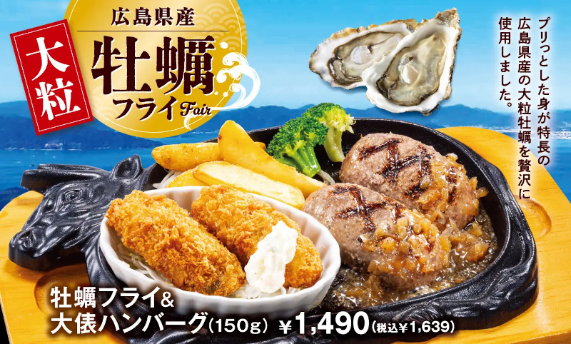 同フェアでは、大粒で身がぷりっぷりの広島県産牡蠣を使用したサクサクの牡蠣フライを、ビッグボーイの看板メニュー「直火焼き大俵ハンバーグ」や「手ごねハンバーグ」とともに楽しめる。ビッグボーイの牡蠣フライには厳選した大粒の広島県産牡蠣を使用している。磯の香りが鼻に抜け、噛めば噛むほど濃厚な旨みが口の中に広がる味わいで、タルタルソースはもちろん、グリルメニューとの相性も抜群だとか。