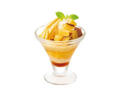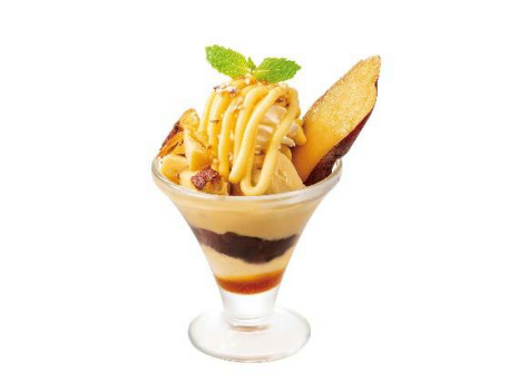 「蜜芋のモンブランパルフェ」は、サンデーはちょっと大きいという人にもおすすめの、蜜芋を味わう秋パルフェ。モンブラン仕立てのなめらかな安納芋ペーストや、角切りのおいもを加えたさつまいもアイスなどをバランスよく盛り合わせた。トッピングは、しっとりとした食感と甘さが魅力の「紅天使」の焼き芋。口いっぱいに広がる濃密な味わいを楽しめる。ゆであずき、みたらしソース、白蜜ゼリーなどの和風素材もアクセントになっている。洗練された雰囲気ながら、どこかホッとする味わいのデザートだという。