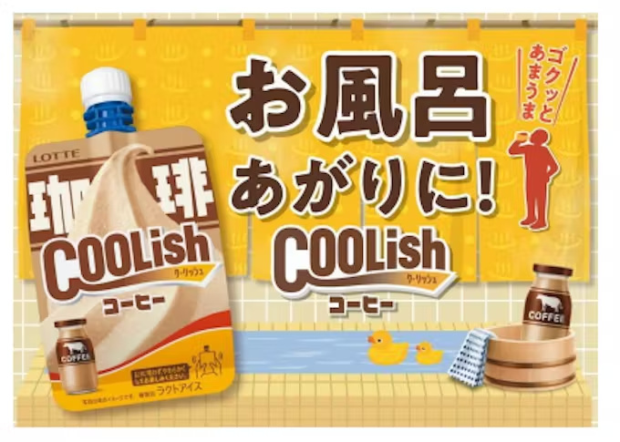 ロッテは、10月27日に、“飲むアイス”の「クーリッシュ」ブランドから、お風呂あがりにチョー気持ちいい!ゴクッとあまうまな「クーリッシュ コーヒー」を発売する。「クーリッシュ」のコーヒーフレーバーは、過去販売した商品も消費者から好評で、気温の下がり始めるこの季節にもマッチしていると考えている。どこか懐かしさを感じられる甘いコーヒーの味わいを微細氷で後味スッキリ楽しめる。パッケージデザインは昔ながらの瓶に入ったコーヒー入り乳飲料をイメージしたレトロなデザインとのこと。また、メインデザインの他に、ロゴに遊び心のあるイラストをあしらったデザインも2種展開する。ぜひお風呂あがりに腰に手を当てて飲んでみてほしい考え。