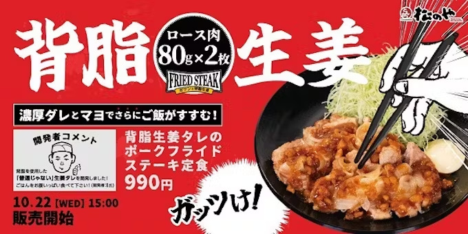 松屋フーズは、とんかつ専門店の「松のや」において、10月22日午後3時から、「背脂生姜タレのポークフライドステーキ定食」を発売する。