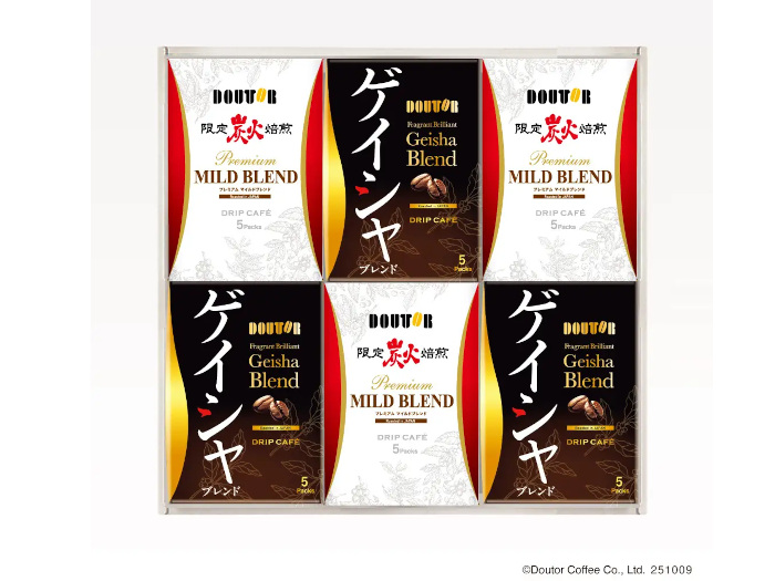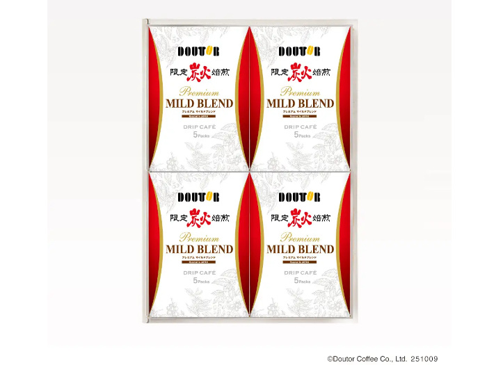 また、11月1日から注文受付を開始する「冬ギフト」では、プレミアムマイルドブレンドを使用したギフトセットを複数ラインアップする。ドトールのこだわりが詰まった、「ドリップカフェ プレミアムマイルドブレンド詰合せ20袋入り」やプレミアムマイルドブレンドとゲイシャブレンドを詰合せた「ドリップカフェ2種詰合せ30袋入り」を数量限定で用意した。