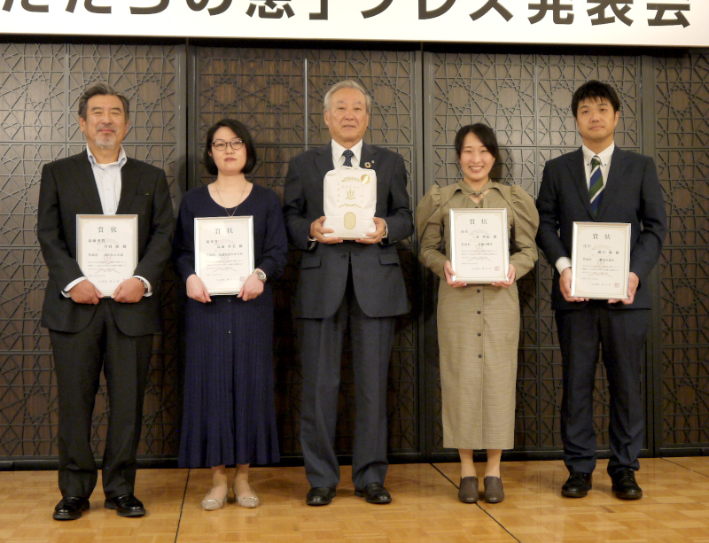 最後に、「あだたらの恵」のブランド名の公募で選ばれた入選者の表彰式が執り行われた。大玉村では、昨年10月から12月末にかけてブランド米の名称を公募し、全国から寄せられた2118点の作品の中から厳正な審査によって、最優秀賞1点、優秀賞1点、佳作2点を選出。最優秀賞の「あだたらの恵」にブランド名を決定した。