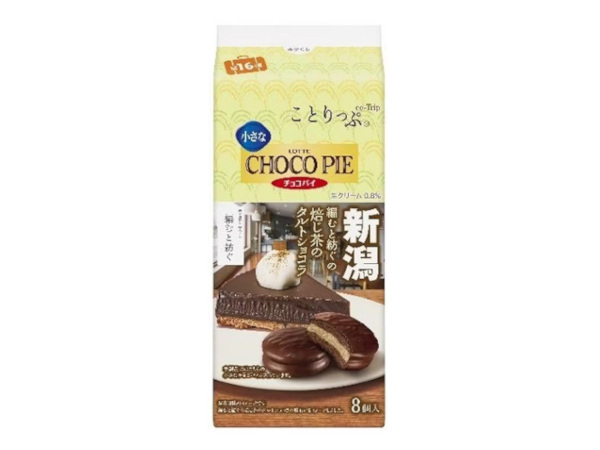 「ことりっぷ 小さなチョコパイ<編むと紡ぐの焙じ茶のタルトショコラ>」は、新潟市の沼垂(ぬったり)テラス商店街にある人気カフェ「編むと紡ぐ」の「焙じ茶のタルトショコラ」の味わいを表現した。焙じ茶パウダーを配合したクリームを、チョコレートを練り込んだ生地でサンドし、焙じ茶とチョコレートの味わいをバランスよく楽しめるように仕立てた。