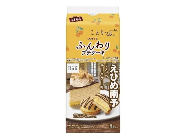 「ことりっぷ ふんわりプチケーキ<リディのチーズケーキ>」は、愛媛県大洲市にある人気カフェ「Ridi」(リディ)の「チーズケーキ」の味わいを表現した。2つのチーズ原料(クリームチーズ0.8%使用(生換算)、エメンタールチーズ0.2%使用(生換算))を使ったクリームを、ビターキャラメルパウダーとチーズパウダーを練り込んだ生地でサンドし、チーズと優しいキャラメルの味わいをバランスよく楽しめるように仕立てた。