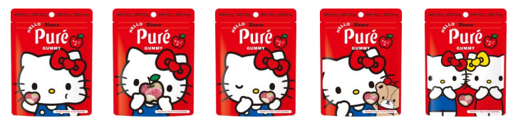パッケージは、レトロかわいい雑貨のような全5種類のデザインで、ピュレグミを頬張ったり、ウインクをしたり、ハローキティの双子の妹ミミィと並んだりと、キュートな姿を楽しめる。