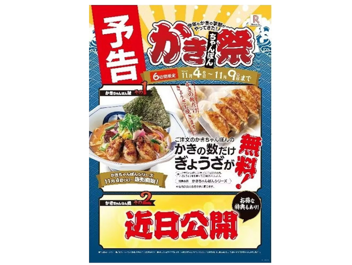 さらに、今年は11月4日~11月9日まで、「かきちゃんぽん祭」を開催する。注文したかきと同じ個数のぎょうざを無料サービスする(にんにくぎょうざは対象外となる)。期間限定となるので、食欲の秋にぜひかきもぎょうざも楽しんでほしい考え。なお、店内での飲食、テイクアウトどちらも対象となる。