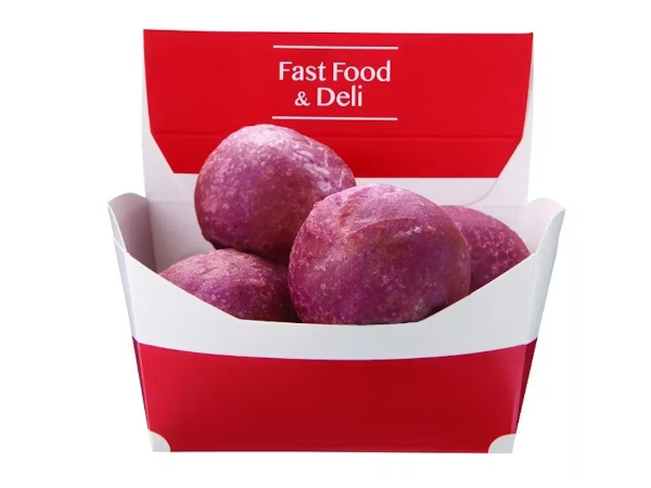 「おさつボール」は、もっちりとした生地に、熱々さつまいも餡を包み込んだおやつにもぴったりな「さつまいもボール」す。生地に紫いもを練りこむことで味に深みを出し、中の餡に使用しているさつまいもは、追熟させることでさつまいも本来の甘みを最大限に引き出した。