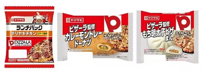 今回、ピザの需要が高まるシーズンに合わせて「ピザーラ」とのコラボ企画を実施する。「ピザーラ」のバラエティーに富んだアイテム群の中から「テリヤキチキン」、「カレーモントレー」、「もち明太子ピザ」の3品をピックアップし、ランチパック、ドーナツ、中華まんの新商品を開発した。