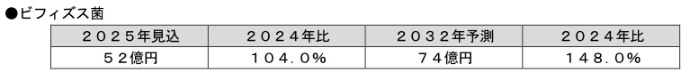 整腸作用など、同様のニーズがある乳酸菌とともに市場が拡大してきたが、乳酸菌が多様な菌体により様々な機能性の解明が進んだ一方、ビフィズス菌は菌種による差別化が乳酸菌ほど進まなかった。しかし、近年になって機能性の再認識や新知見、用途拡大が進んでおり、今後はビフィズス菌を機能性訴求の主軸とした商品の増加が期待できる。未開拓領域が減っているため、競合が激化している乳酸菌と比較して高い伸びで推移するとみられる。