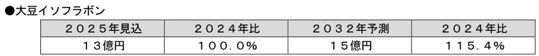 機能性表示食品としては骨の成分維持に役立つ、をヘルスクレームとした商品が多いが、近年のフェムケアへの関心の高まりから、更年期の不調改善、肌の弾力や水分量の維持といった需要も増加している。認知度の高さやフェムケア関連の対応進展、肌ケア関連のエビデンス蓄積によって今後も市場拡大が続くとみられる。女性における成分の認知度は非常に高いため、特にフェムケア訴求商品においては、ヘルスクレームが限られる機能性表示食品としてではなく単に“大豆イソフラボン配合”という表記で展開する商品も今後増えていくとみられる。