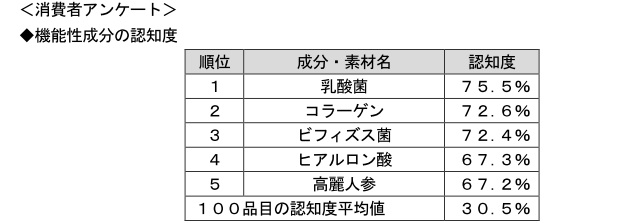 機能性成分・素材100品目について、消費者1万人の認知度を調査し、ランキング化した。乳酸菌、コラーゲン、ビフィズス菌の認知度が70%を超え、順位の違いはあるが、男女ともにトップ3は同じ顔ぶれであった。