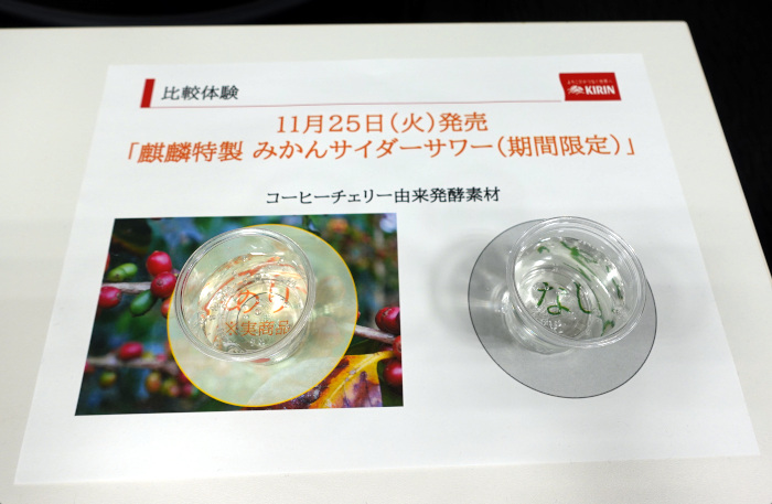 「このコーヒーチェリー由来の発酵香料素材をキリンビール商品開発研究所へ提案し、同研究所での処方設計を経て、今年4月から『麒麟特製』シリーズに採用。『麒麟特製』らしい上質感のある豊かな味わいとしっかりとした飲みごたえを実現。余韻が楽しめる味わいにブラッシュアップも行った」と、発酵素材が「麒麟特製」ブランドに採用され、これまでに「麒麟特製 クリアサワー」(現在は終売)、「麒麟特製 メロンソーダサワー」、11月25日から期間限定発売の「麒麟特製 みかんサイダーサワー」で使用されたのだと教えてくれた。