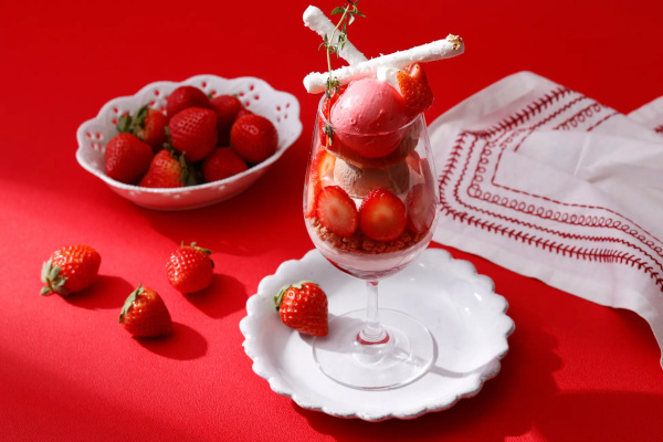 「いちごパフェ」は、苺のシャーベットやムース、ゼリーなど、様々な苺のアレンジを重ね、サクサクのメレンゲやラングドシャ、ホワイトチョコクランチの食感をアクセントに、苺の甘酸っぱさを華麗なビジュアルで表現した。ケーキは、粒よりのあまおうを使用した王道を極めた美味しさが魅力のショートケーキや、苺の果実味を楽しめるタルト、パイ生地と苺の食感のハーモニーが楽しめるミルフィーユ、苺ムースに紅茶のスフレを忍ばせ生クリームをフリルのように絞った可愛らしい装いのムースの4種類を用意した。“苺”の爽やかな甘さと華やかな見た目に心躍る期間限定スイーツを、この機会にぜひ楽しんでほしいという。