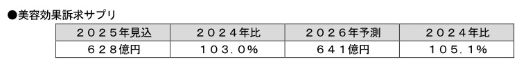 2024年は、飲み物や料理に溶かして摂取するコラーゲンパウダーが日常生活での取り入れやすさもあり好調だったものの、全体では広告投下の抑制がみられ市場の伸びは鈍化した。2025年は、引き続きコラーゲンパウダーが好調なことに加え、ビタミンC配合商品が比較的若い層に注目されたことから、市場は拡大が続くとみられる。
