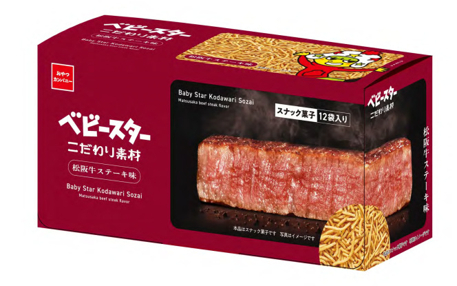 「ベビースターこだわり素材」シリーズは、三重の恵みを楽しめる贅沢な3品。「ベビースターこだわり素材(松阪牛ステーキ味)」は、三重県産松阪牛の牛肉ミンチを生地に練り込み、松阪牛の旨みと重厚な味わいのステーキ味を堪能できる。