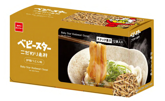「ベビースターこだわり素材(伊勢海老味)」は、三重県産伊勢海老エキスを使用した。伊勢海老を焼いた香ばしさととともに伊勢海老の風味と甘みが口いっぱいに広がる。「ベビースターこだわり素材(伊勢うどん味)」は、三重県の郷土料理「伊勢うどん」を表現した。伊勢の老舗の糀屋のたまり醤油と熊野灘のかつお節使用し、濃厚な伊勢うどん味に仕上げた。